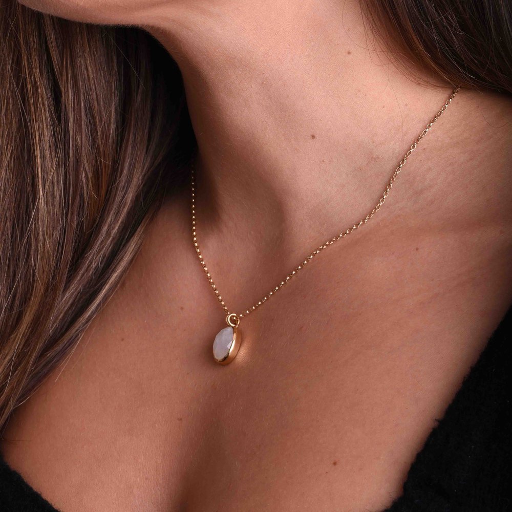 A delicate green moonstone pendant on a stainless steel chain, blending ethereal beauty with timeless elegance. Hypoallergenic & tarnish-resistant for everyday wear.